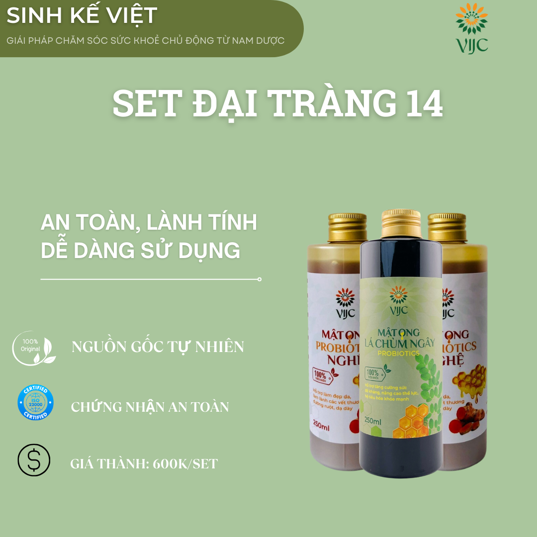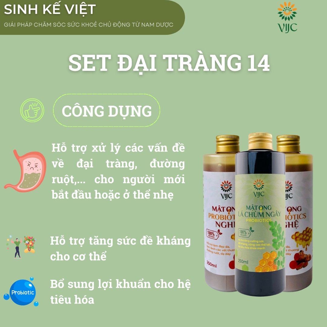 Sét đại tràng 14 bao gồm: 01 Mật ong Lá Chùm Ngây Probiotics, 02 Mật ong Nghệ Probiotics.
